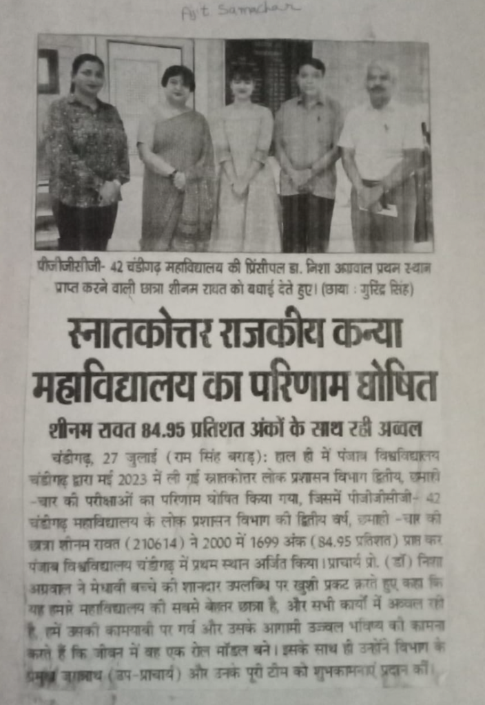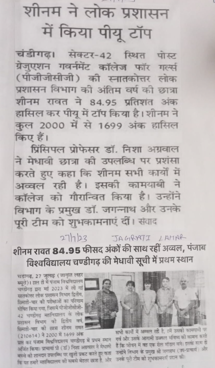 Sheenam Rawat stood 1st in M.A Public Administration in Panjab University, Chandigarh, secured 84.25% marks during the session 2022-23