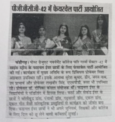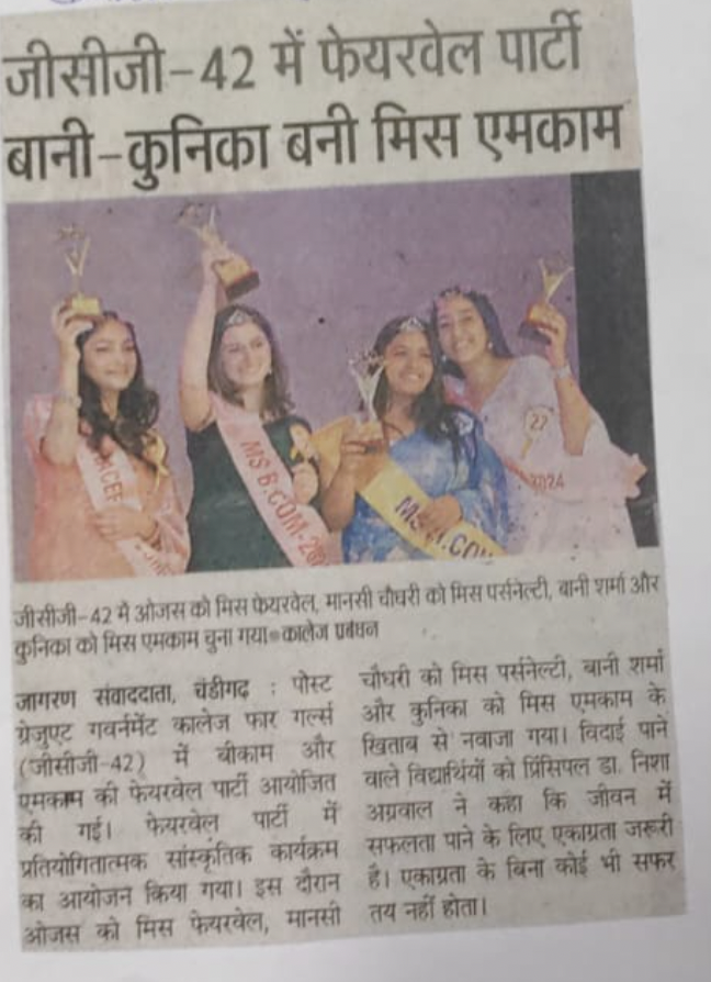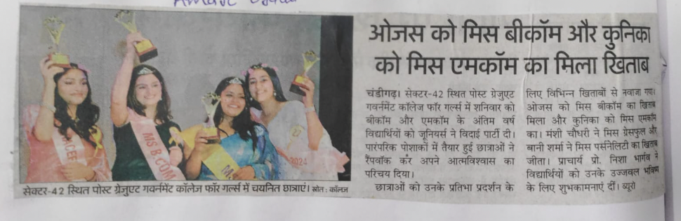 Farewell Party for B.Com-III Year Students, held on April 20, 2024. The titles of Miss B.Com. were given to Ojas, Miss Graceful to Manshi Choudhary, Miss Personality to Bani Sharma, and Kunika was crowned Miss M.Com.