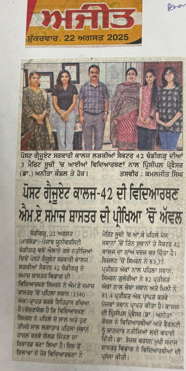 Department of Sociology, PGGCG-42, creates history with First Position in M.A. Sociology for the third consecutive year at Panjab University, Examination 2025