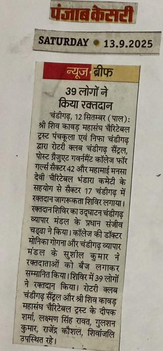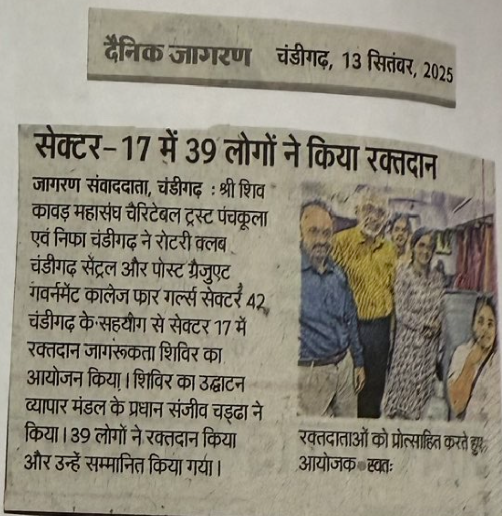 चंडीगढ़ में आयोजित शिविर में 39 लोगों ने किया रक्तदान – 12 सितम्बर 2025