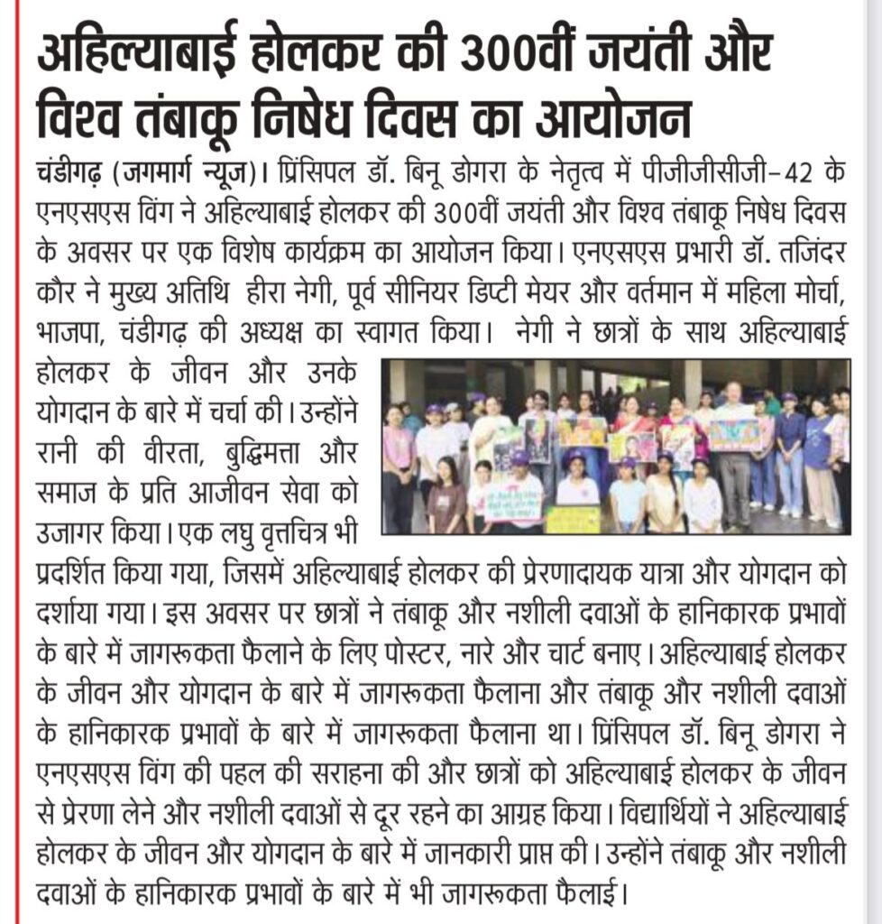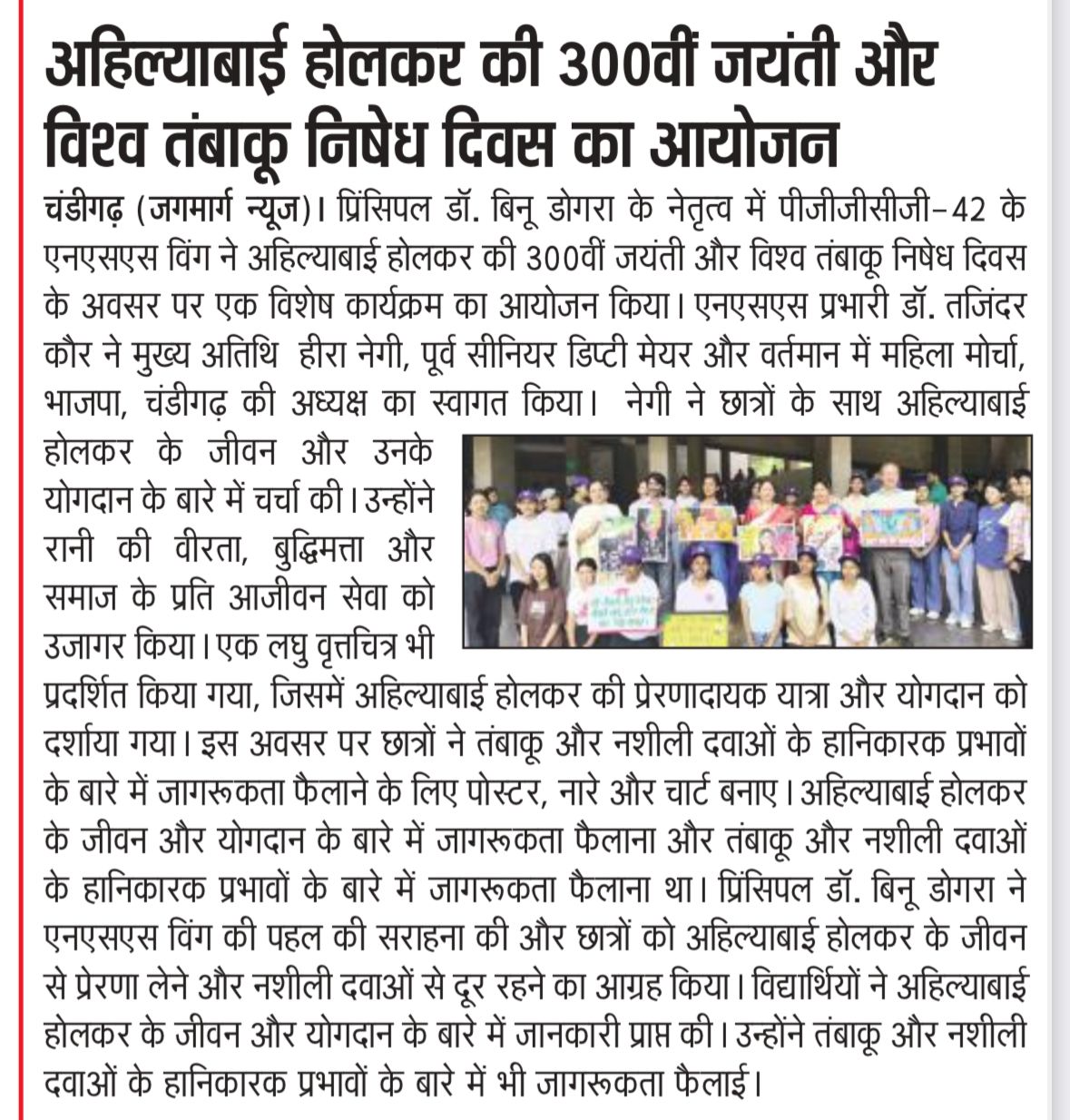 Celebration of the 300th birth anniversary of the legendary Ahilyabai Holkar and to mark World No Tobacco Day on 31 May 2025.