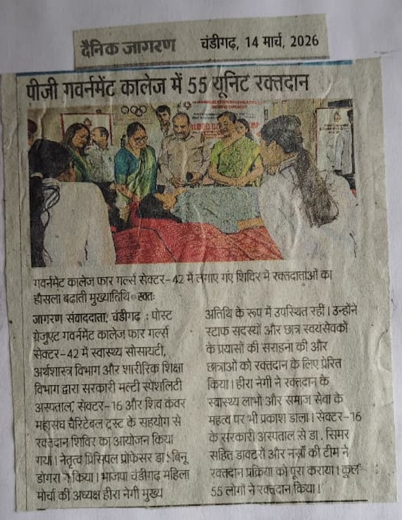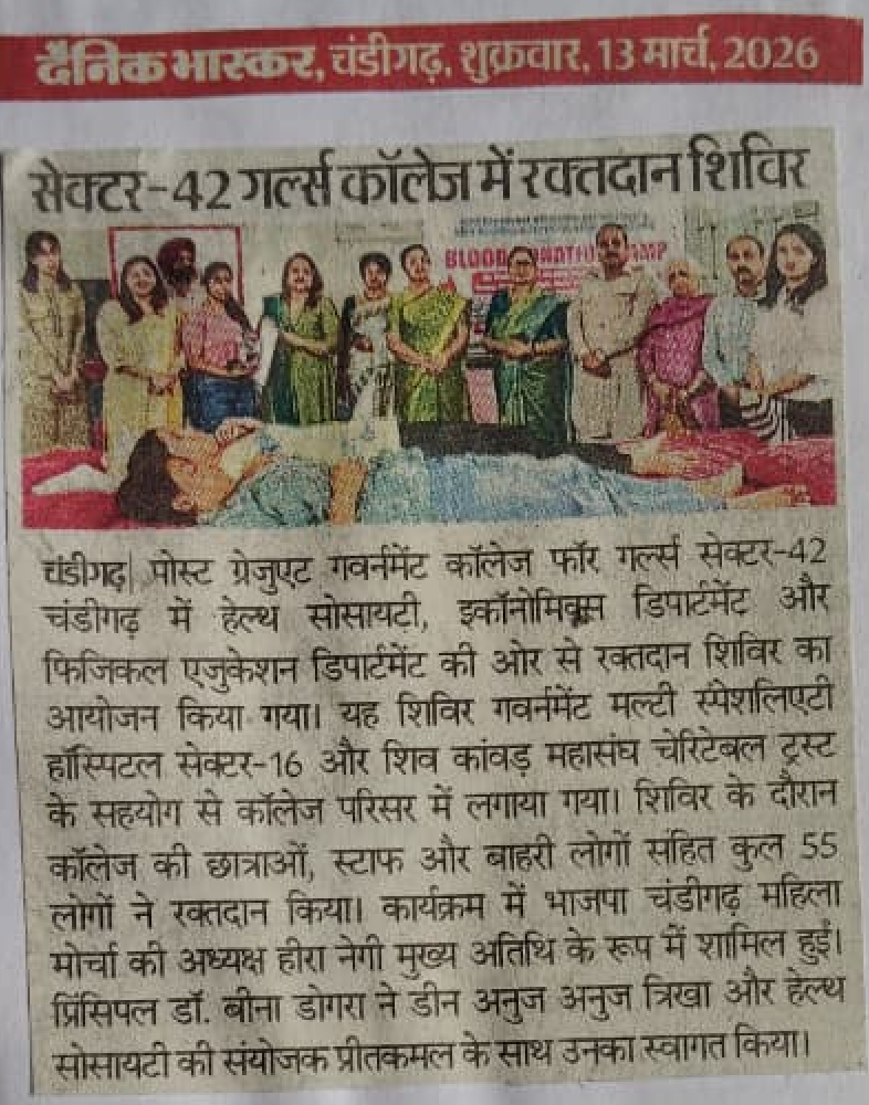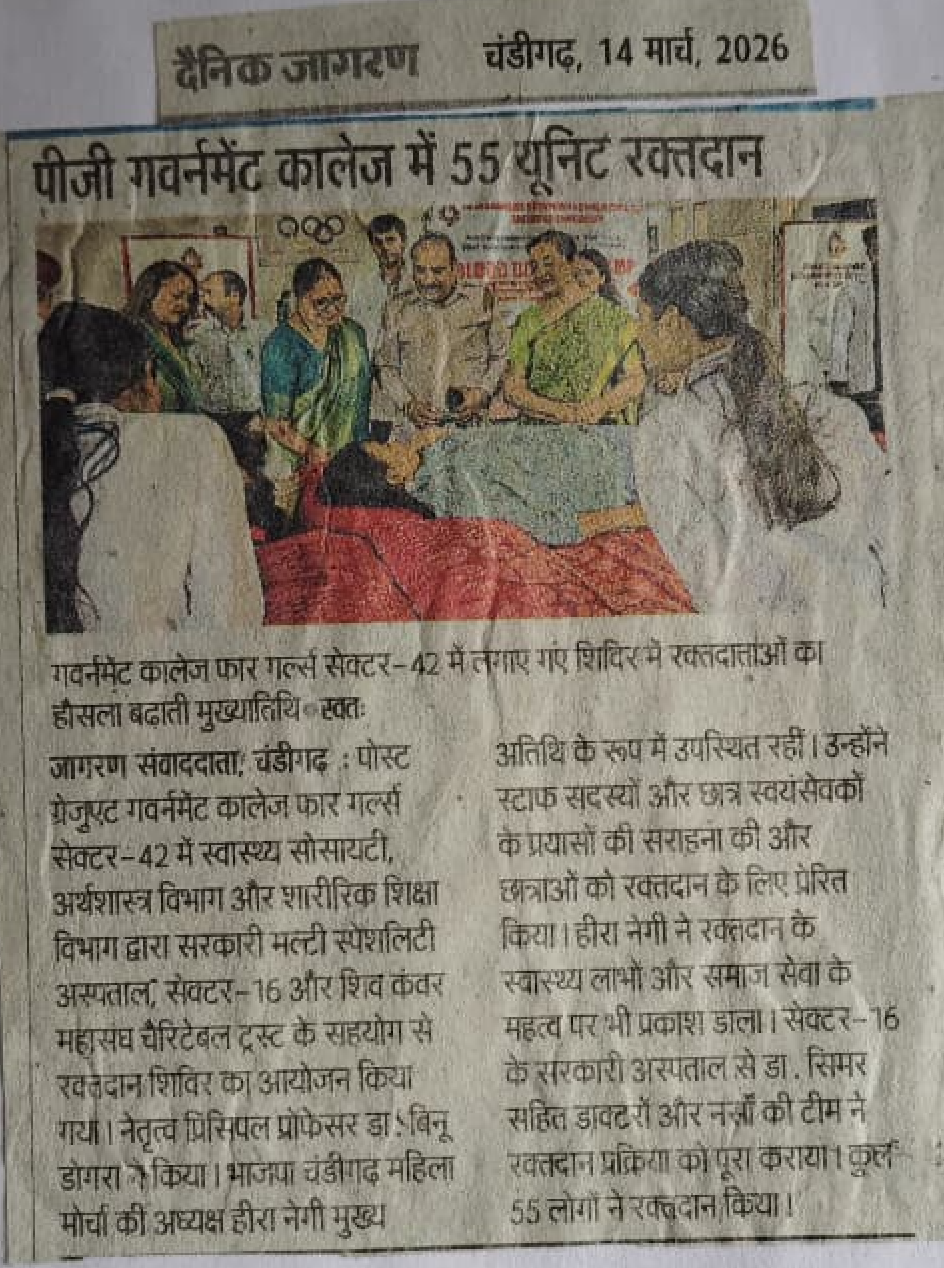 Health Society, Department of Economics and Department of Physical Education in collaboration with Government Multi-Specialty Hospital, Sector-16, Chandigarh and Shiv Kanwar Mahasangh Charitable Trust today organised a Blood Donation Camp on 11 March 2026