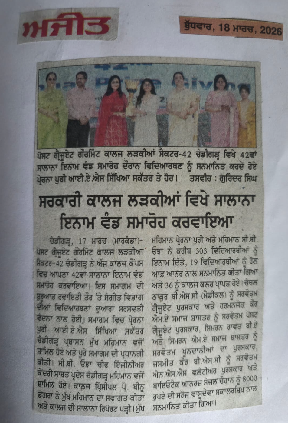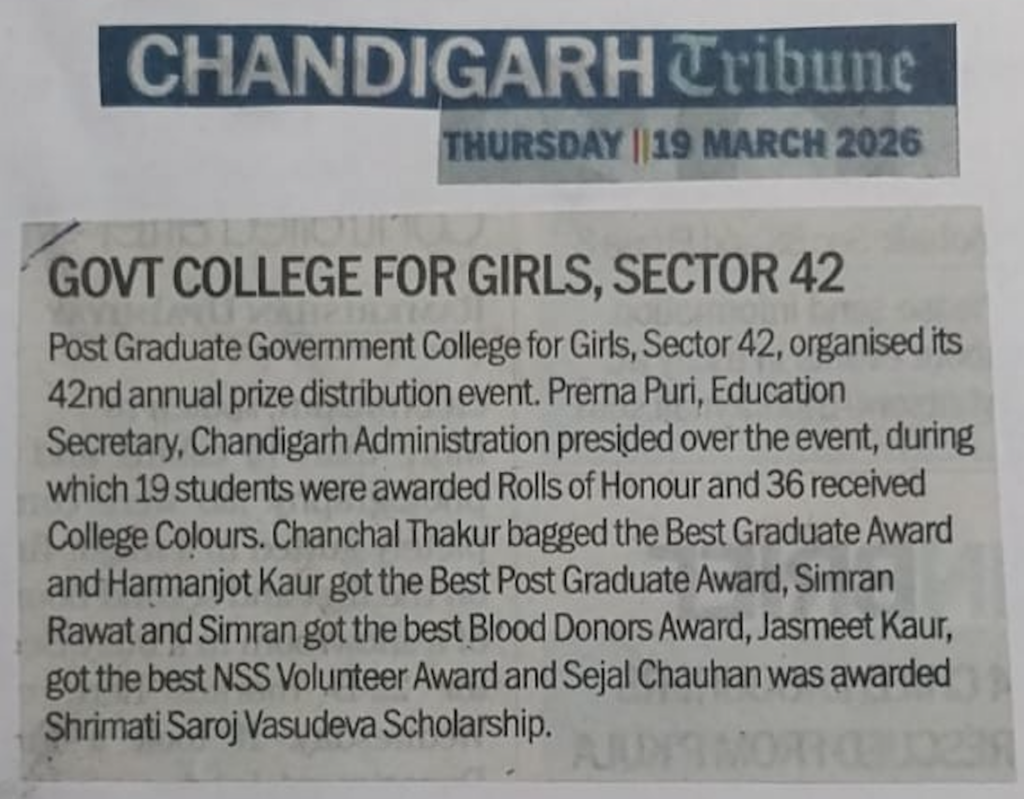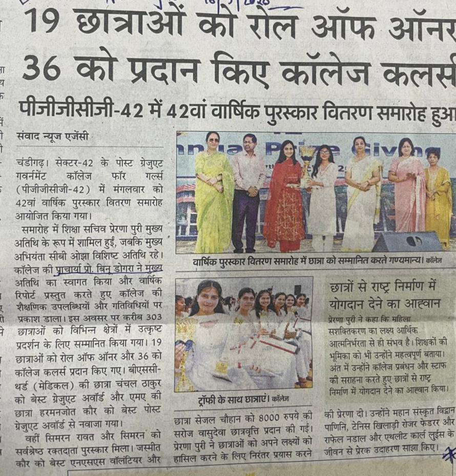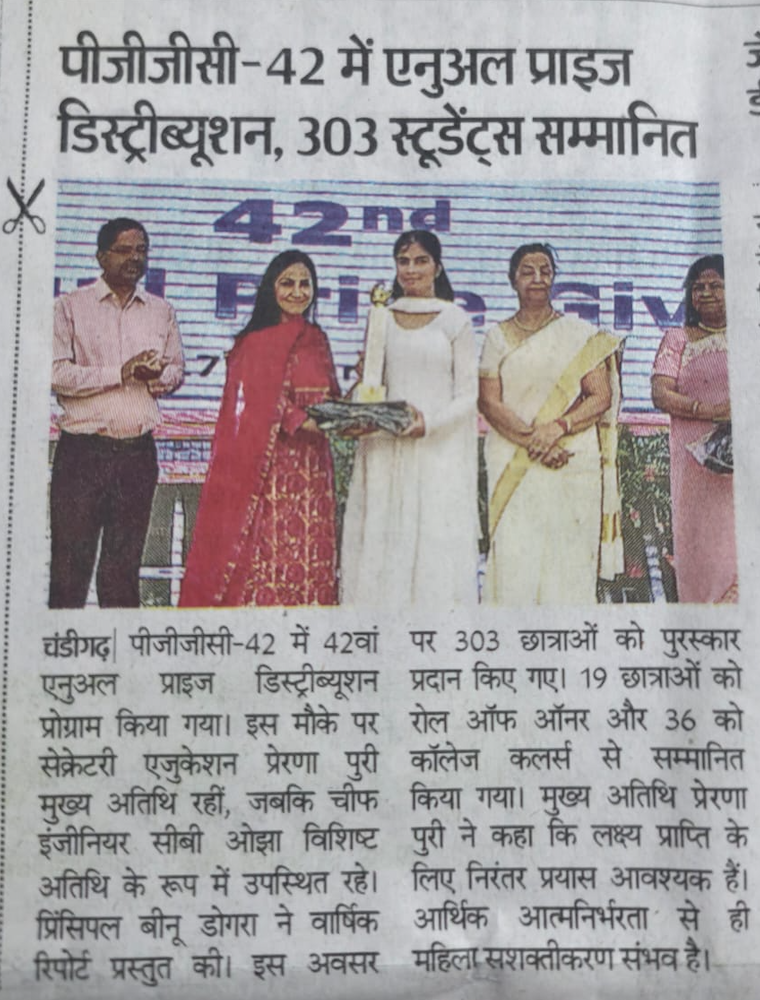 42nd Annual Prize Giving Function held on 17 March 2026. Ms. Prerna Puri, IAS, Education Secretary, Chandigarh Administration presided over the function as Chief Guest. Sh. C.B. Ojha, Chief Engineer, UT Chandigarh was the Guest of Honour