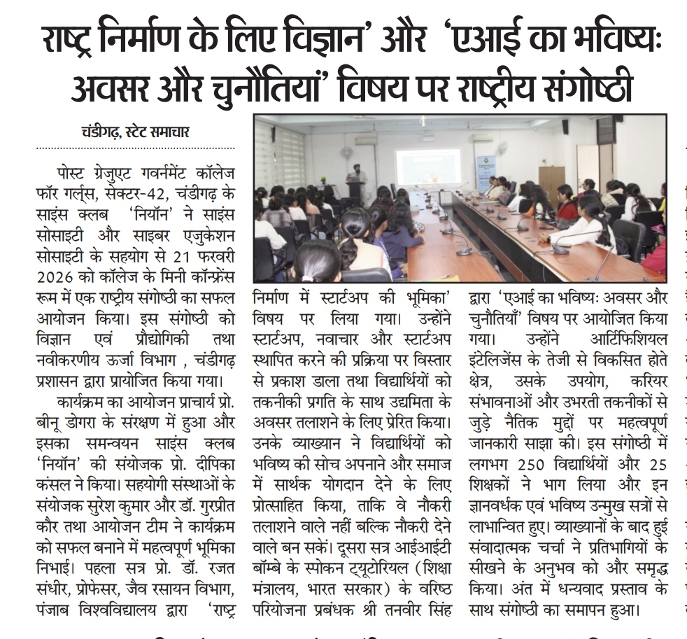 National Seminar on “Science for Nation Building” and “The Future of AI: Opportunities and Challenges” held on on 21 February 2026