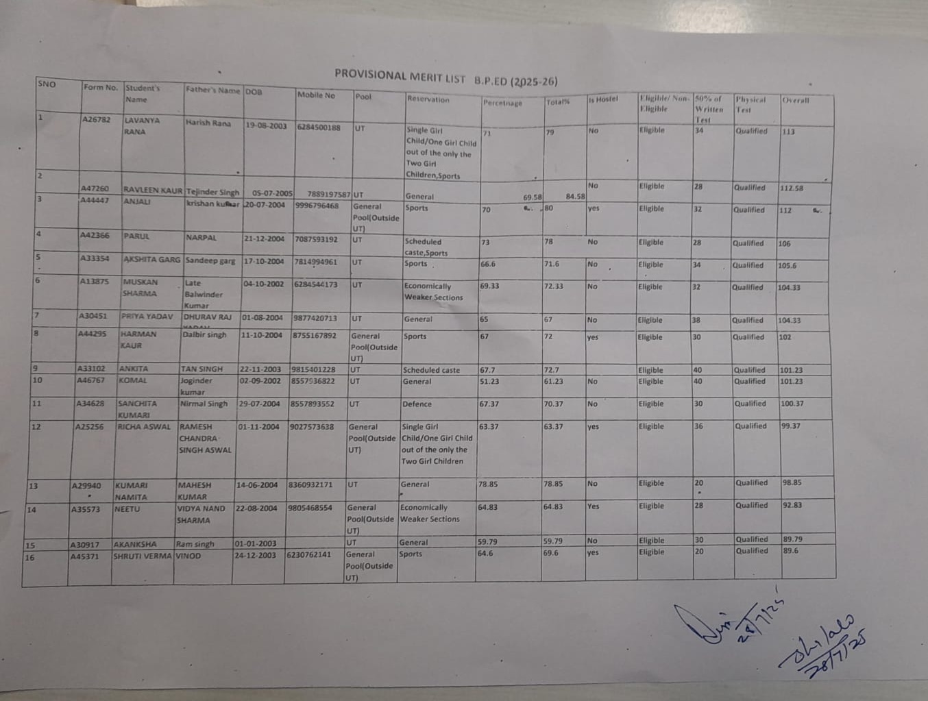 Provisional Merit List B.P.Ed for the Session 2025-2026