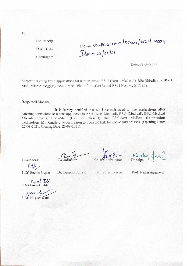 Submission of Willingness Form for Admission in PGGCG-42, Chd 2021-2022 through Google Form Date: 13 Sep 2021