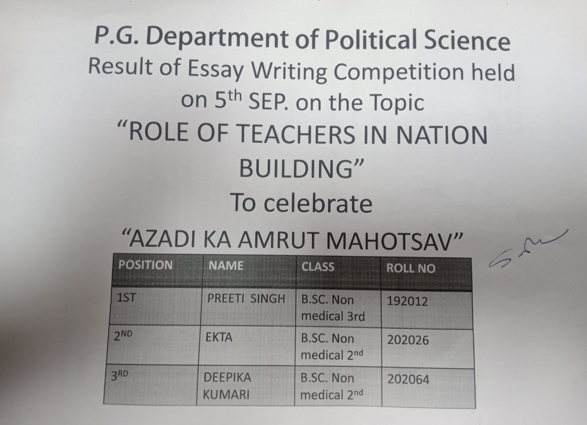 Results of Essay Writing Competition “Role of Teachers in Nation Building” held on 05 Sep 2021 , under the aegis of Ministry of Education, New Delhi to celebrate “AZADI KA AMRIT MAHOTSAV –INDIA@75” Date: 08 Aug 2021
