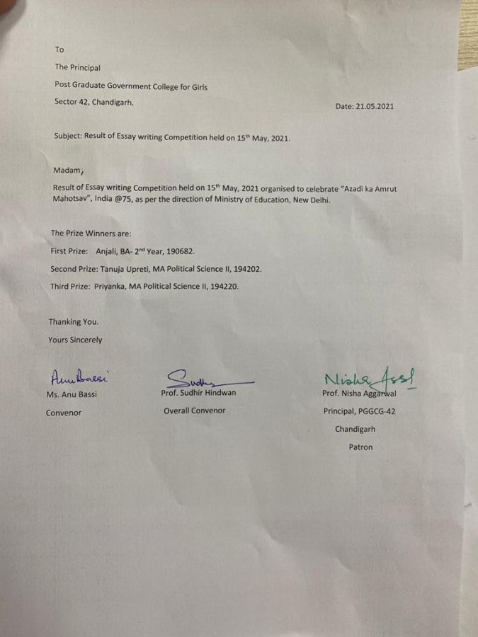 Result of Intra-college Debate and Collage Making Competition held 26 May 2021, under the aegis of Ministry of Education , New Delhi to celebrate “Azadi Ka Amrit Mahotsav, India @75” Date: 29 May 2021