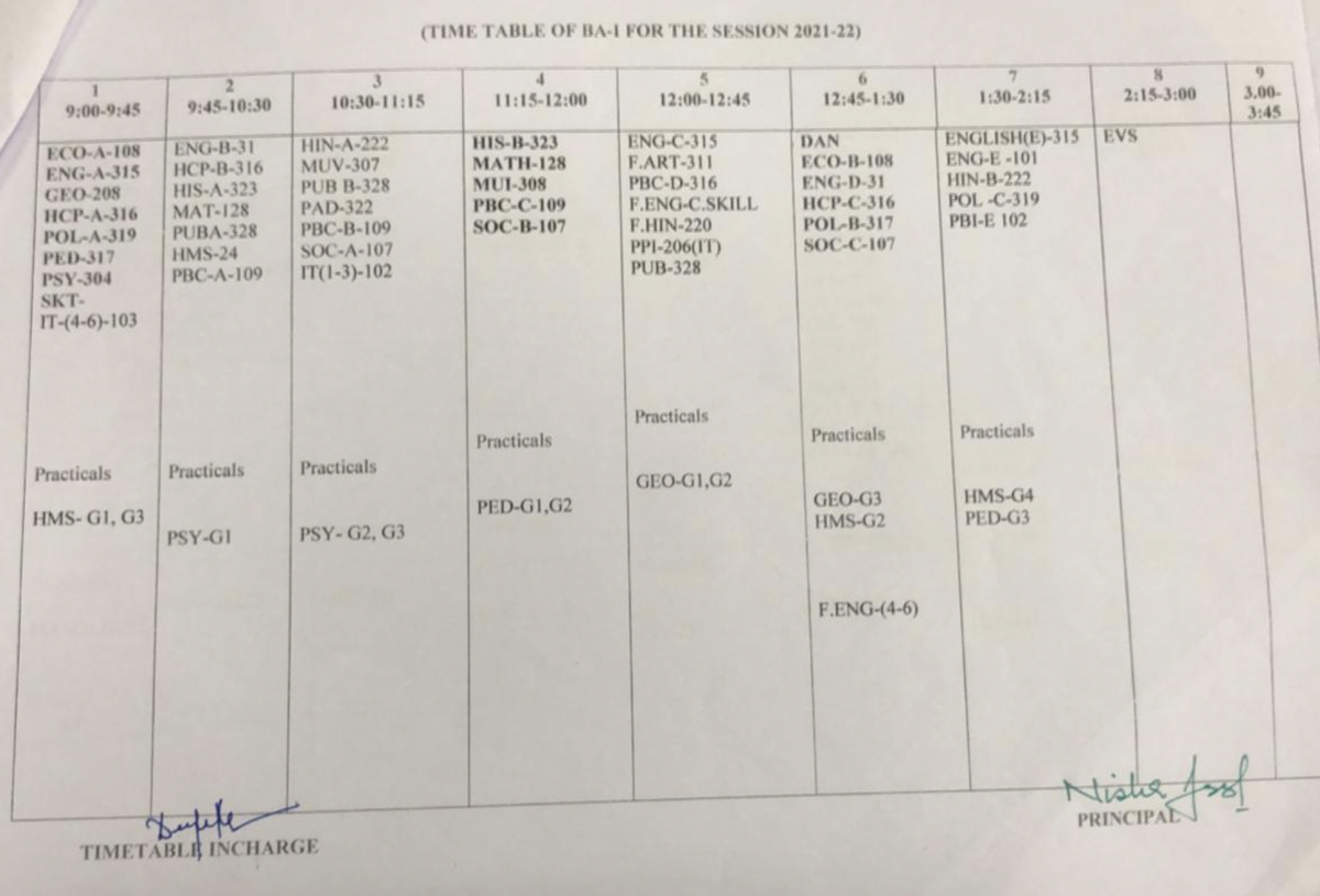 Time Table BA-1 Classes Odd Semester 2021-2022