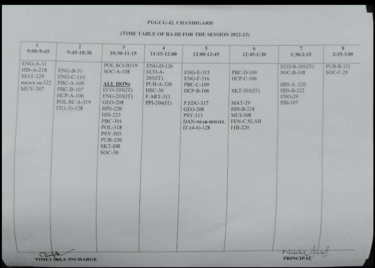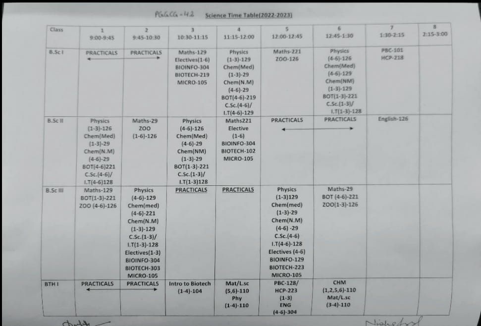 Time Table Science Classes Odd Semester 2022-2023
