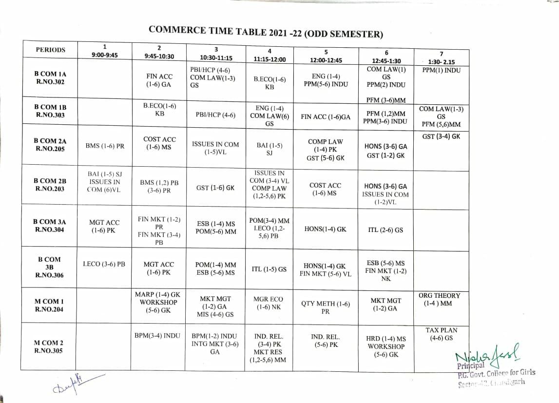 Time Table Commerce Odd Semester 2021-2022