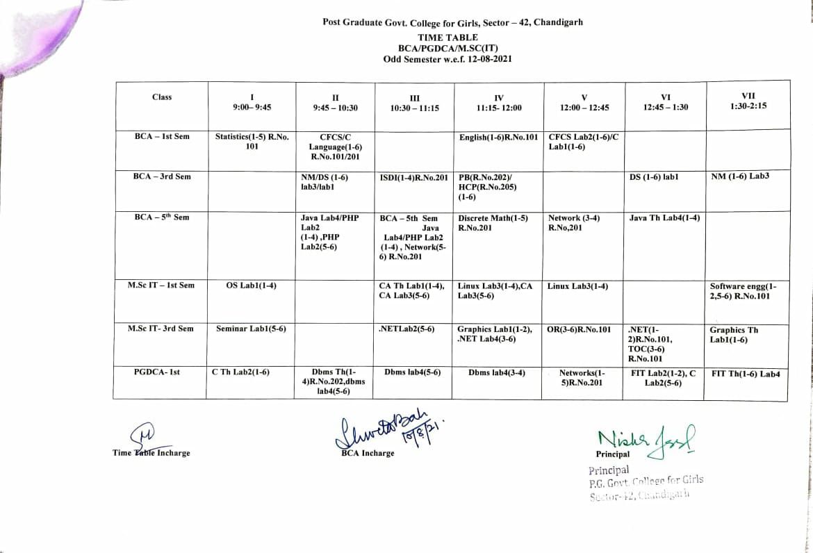 Time Table M.Sc (IT) PGDCA BCA Classes Odd Semester 2021-2022